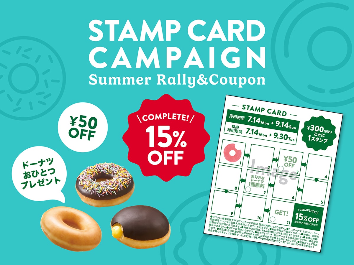 ・スタンプカード特典のお好きなドーナツ引換は「ミニドーナツ」「ミニクルーラー」「店舗限定ドーナツ」は引換対象外となります。