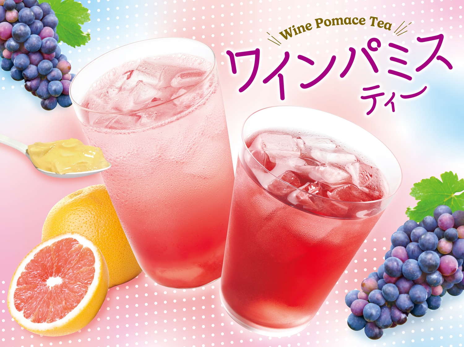 「丸の内オアゾ店」で販売する新商品『ワインパミスティー(ホット/アイス)』『ピーチジェリー in ソーダ グレープフルーツ&ワインパミスティー』で使用しているアップサイクル原料「ワインパミス」は、ワインの製造工程で生じるブドウの果皮などのことで、ぶどうの皮や種由来のポリフェノールが豊富に含まれています。