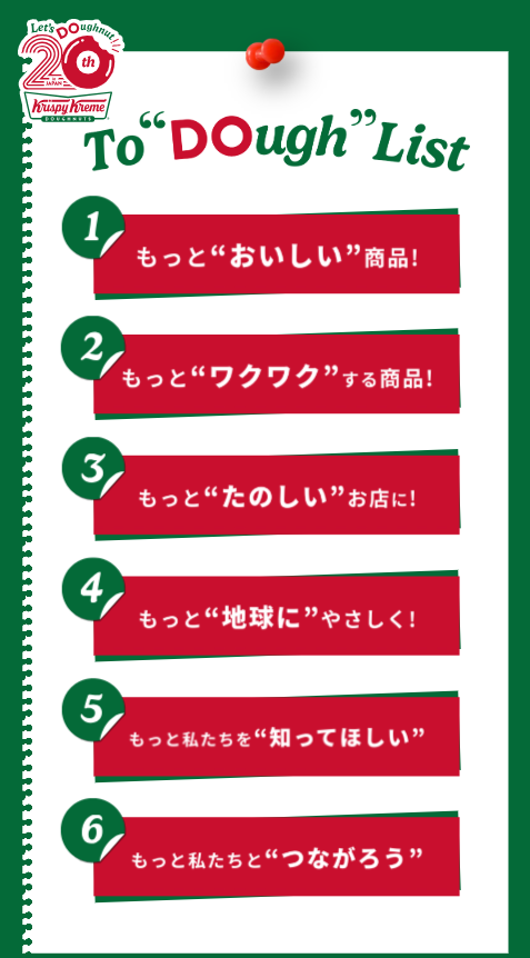 「To DOugh List(トゥードーリスト)」も同じく<DO(やろう・取り組もう)>と<Doughnut(ブランドの象徴)>をかけあわせた造語で、私たちがすべてのお客様に伝えたい6つの項目「もっとおいしい商品」「もっとワクワクする商品」「もっとたのしいお店に」「もっと地球に優しく」「もっと私たちを知ってほしい」「もっと私たちと繋がろう」をもとに、1年間を通してたくさんの日常の小さな喜び=『Little Joy』を全国のみなさまにお届けしていきます。